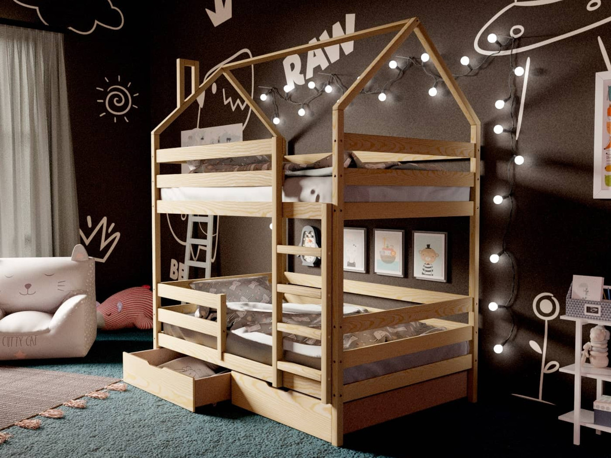 Двухъярусная кровать-домик без покраски 80х190 см с ящиками