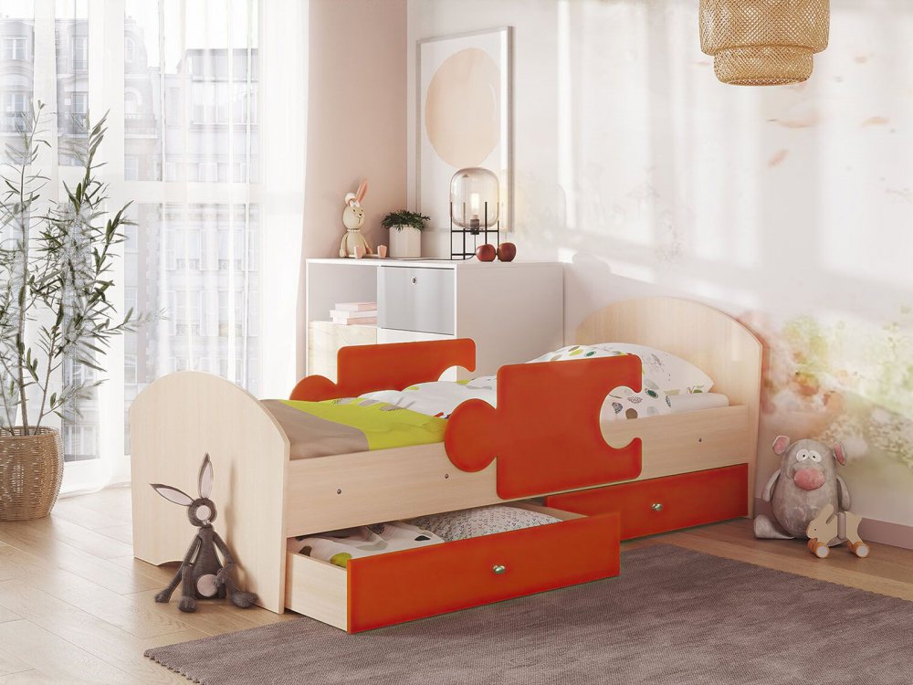 - Кровать Мозаика с бортиками и ящиком млечный дуб с оранжевым