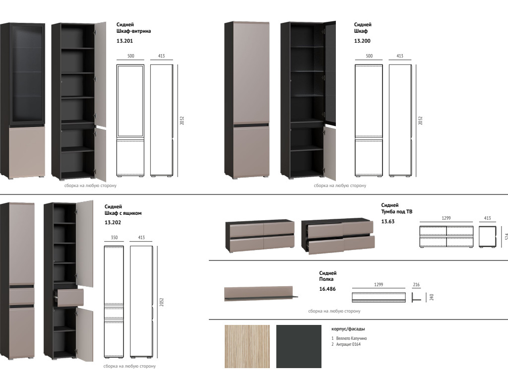 - Шкаф 13.200 (46,7 кг; 0,096 м3) 500 x 413, В 2052 мм сборка на любую сторону