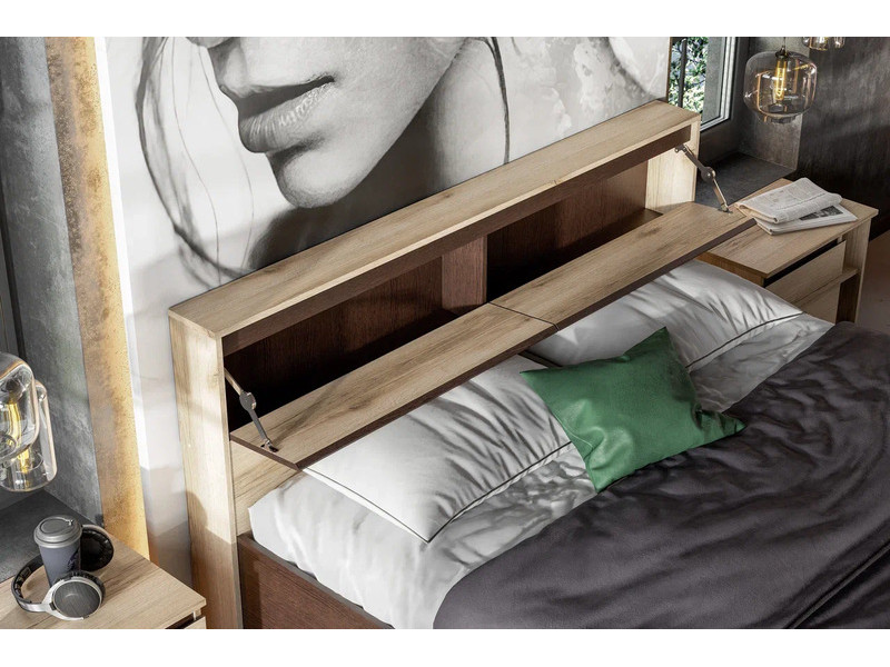 Массивное изголовье оборудовано двумя скрытыми ящикам с откидными створками для хранения необходимых в зоне сна предметов.