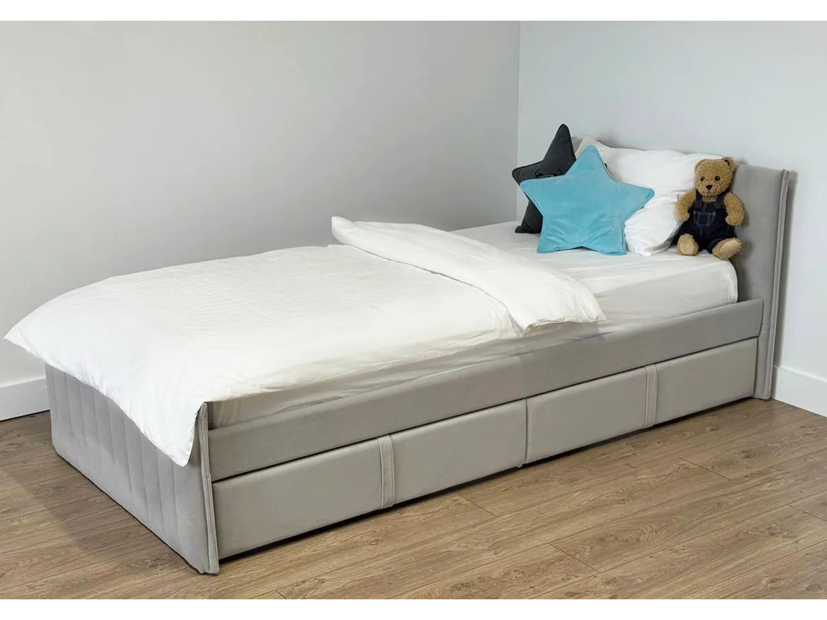 Дополнительно можно приобрести наматрасник в цвет обивки и мягкий ограничитель.