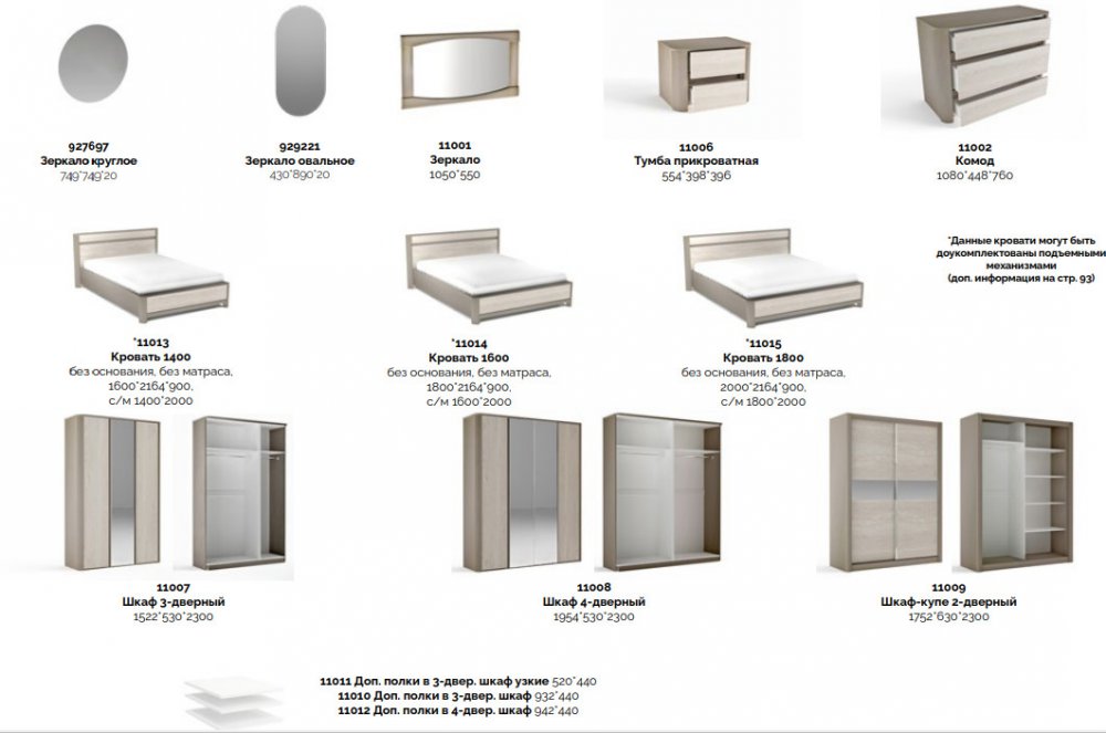 Цена за комплект: Тумбочка прикроватная (2 шт), Кровать с/м 2000*1400, Ортопедическое основание 1400*2000, Шкаф-купе 2-х дверный, Зеркало, Комод