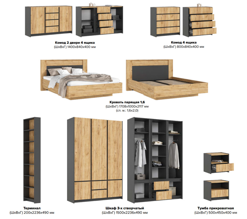 Цена за комплект: Тумбы прикроватные, Кровать парящая 1,6м (ортопед дерево), Шкаф 3-х створчатый