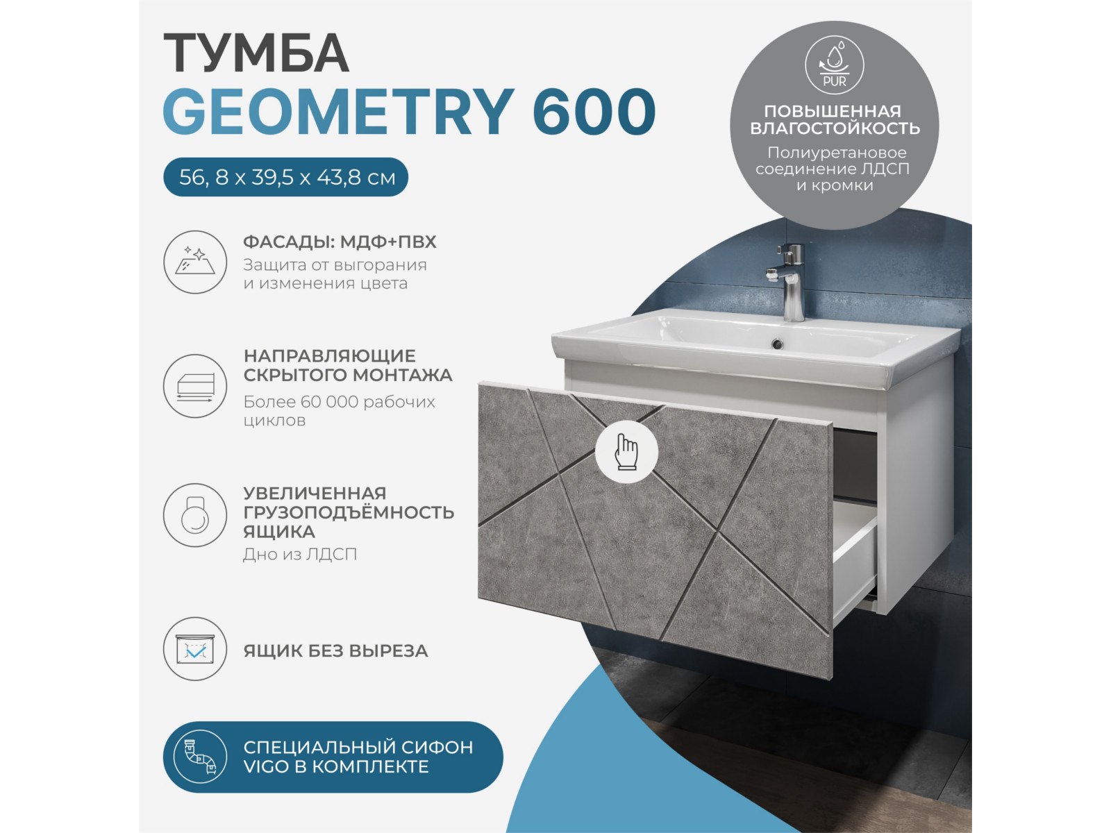 Размер тумбы с раковиной (ШxГxВ): 600x450x420 мм