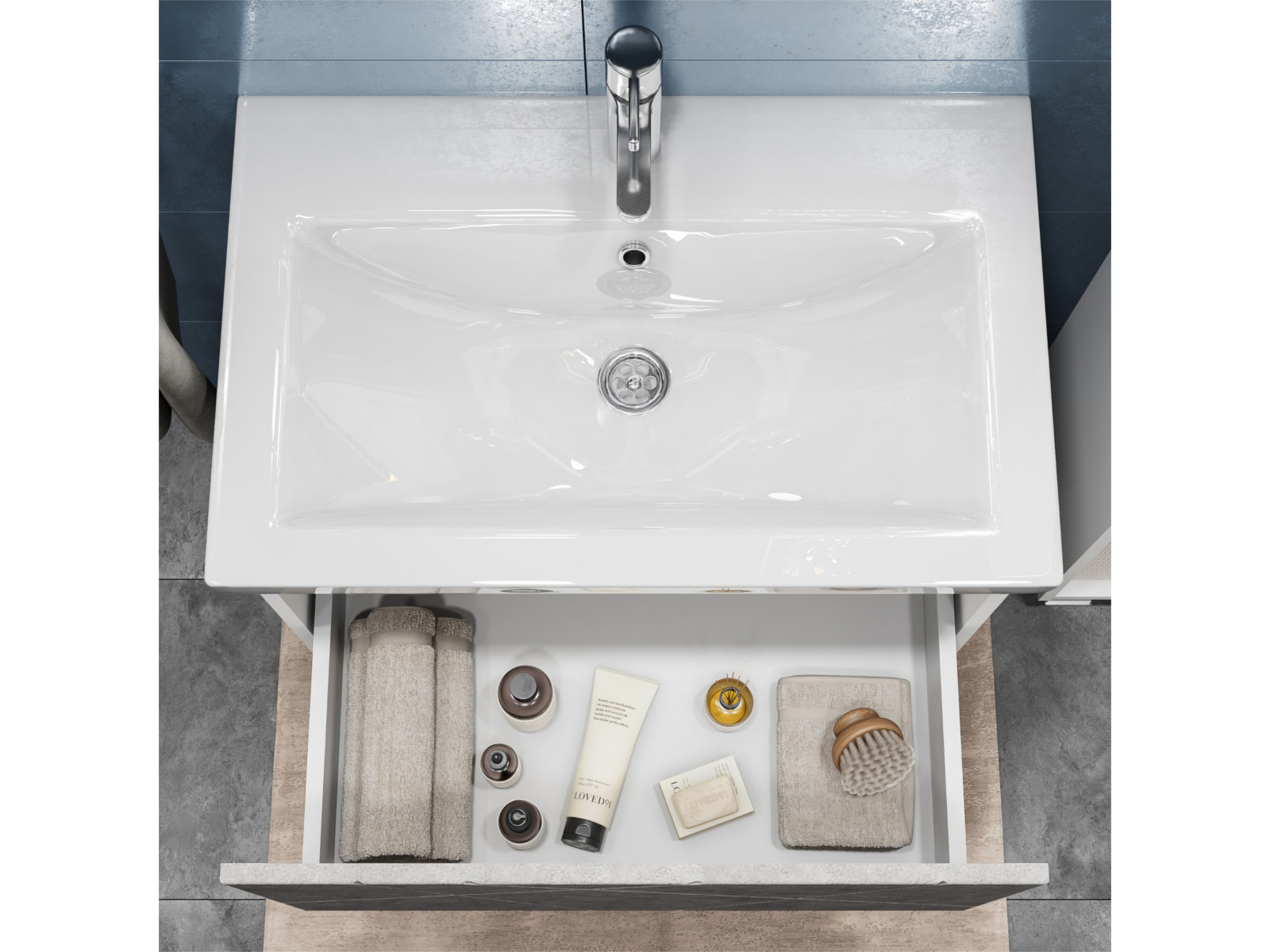 Оснащение: 1 выдвижной ящик, направляющие скрытого монтажа, открывание нажатием "push-to-open", 2 навеса, 1 сифон