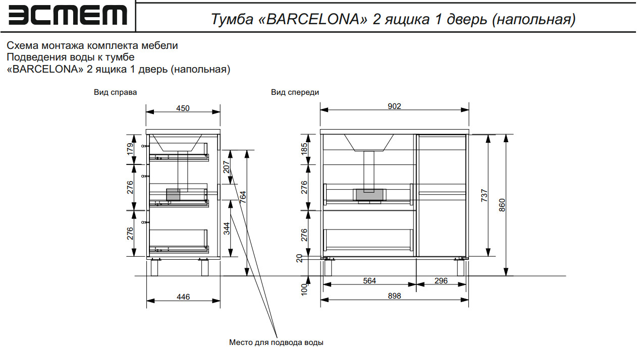 - Тумба с раковиной Barcelona 900 левосторонний напольный 2 ящика 1 дверь