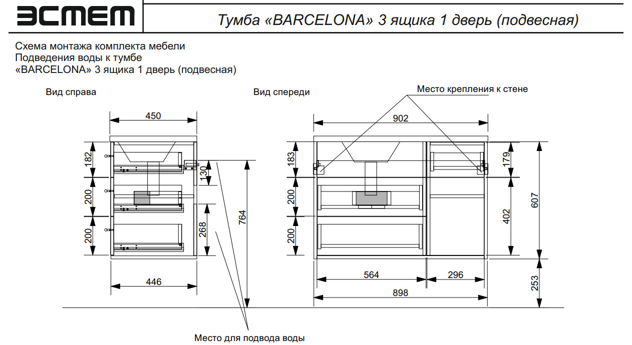 Тумба с раковиной Barcelona 900 левосторонний подвесной 3 ящика 1 дверь