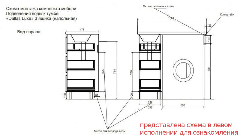 Тумба с раковиной Dallas Luxe 1000 напольная 3 ящика правая