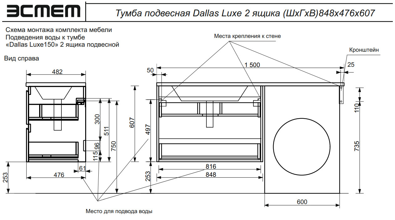 - Тумба с раковиной Dallas Luxe 1500 навесная 2 ящика левая