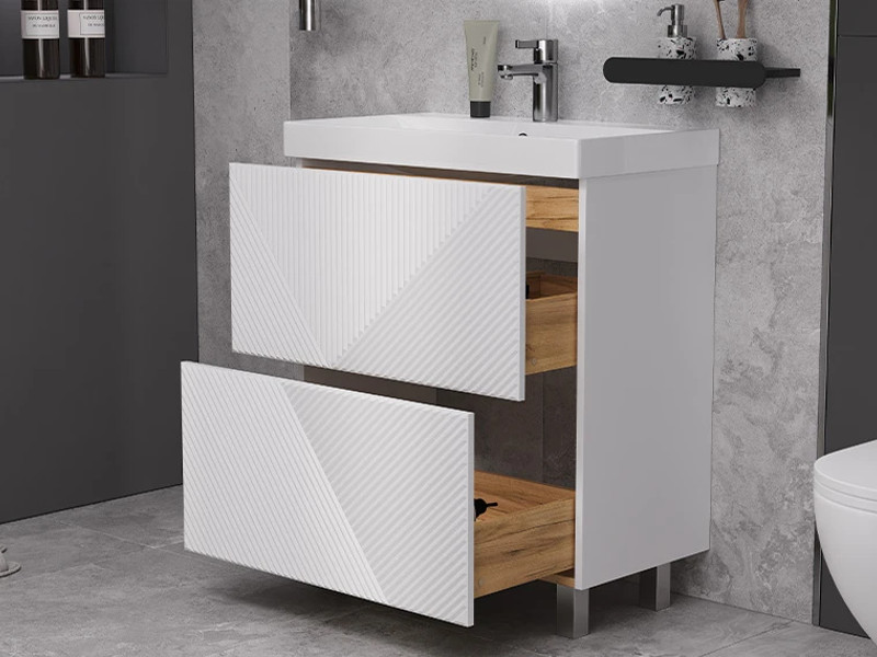 Материалы тумбы: МДФ, влагостойкая ЛДСП, полимерное покрытие ПВХ, врезная ручка, европейская фурнитура