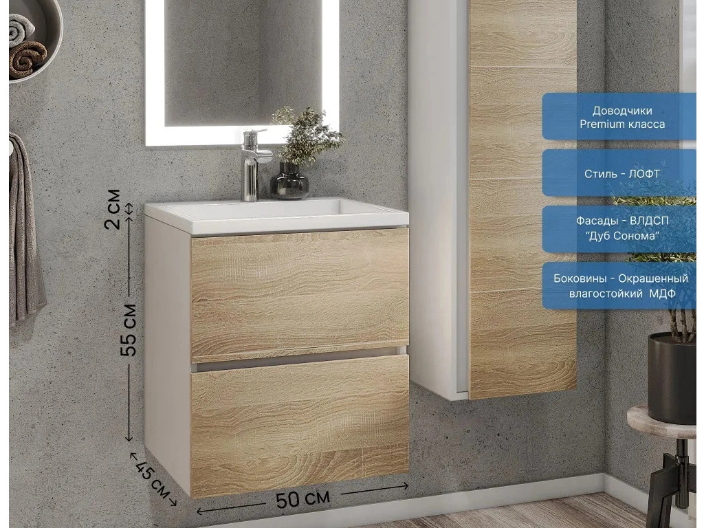 Фасад - ЛДСП в пленке под дерево, цвет дуб сонома. Выдвижные ящики изготовлены из влагостойкой ЛДСП. Ящики оснащены доводчиками. Фурнитура и доводчики премиум класса.