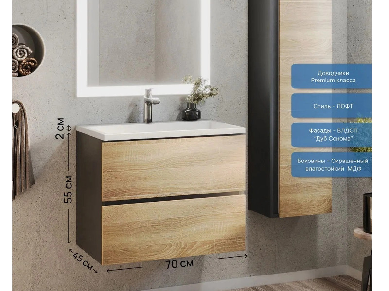 Фасад - ЛДСП в пленке под дерево, цвет дуб сонома. Выдвижные ящики изготовлены из влагостойкой ЛДСП. Ящики оснащены доводчиками. Фурнитура и доводчики премиум класса.