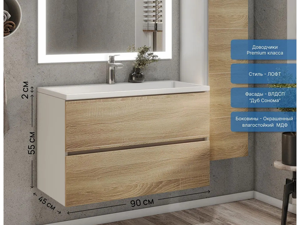 Фасад - ЛДСП в пленке под дерево, цвет дуб сонома. Выдвижные ящики изготовлены из влагостойкой ЛДСП. Ящики оснащены доводчиками. Фурнитура и доводчики премиум класса.