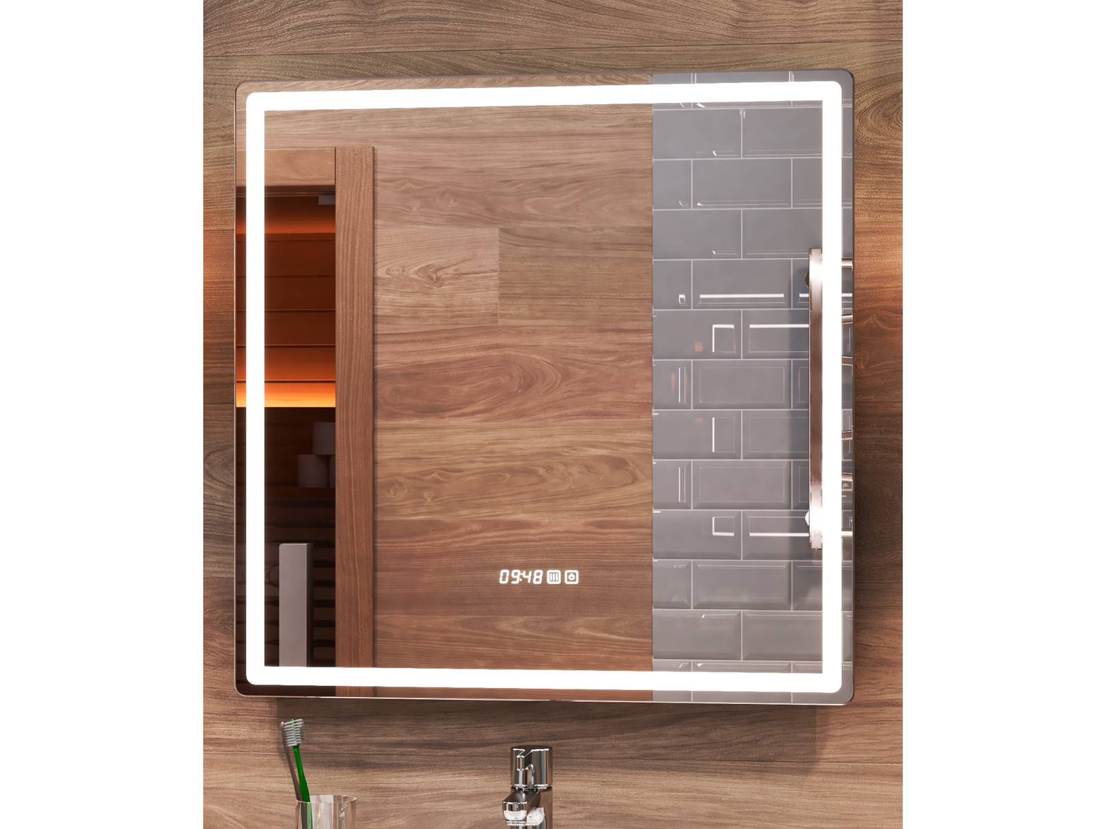 Оснащение: LED подсветка по периметру, сенсорное управление, часы, функция