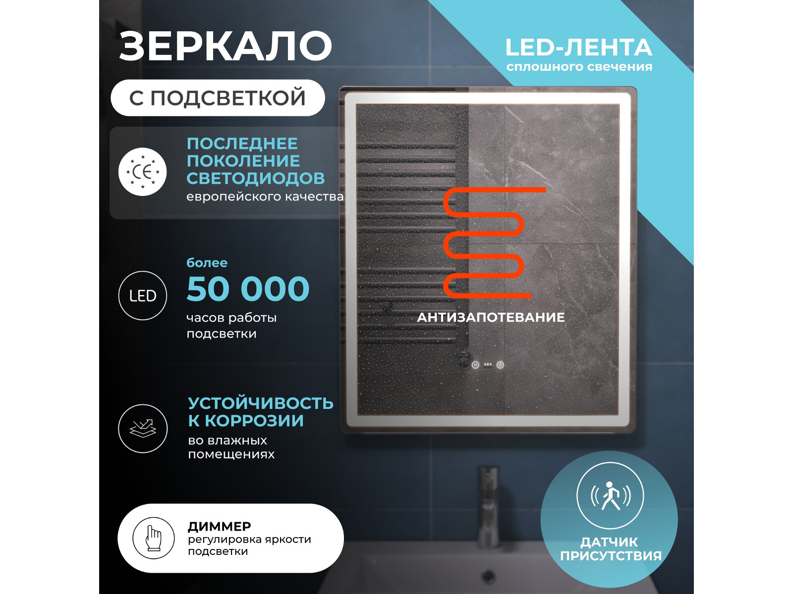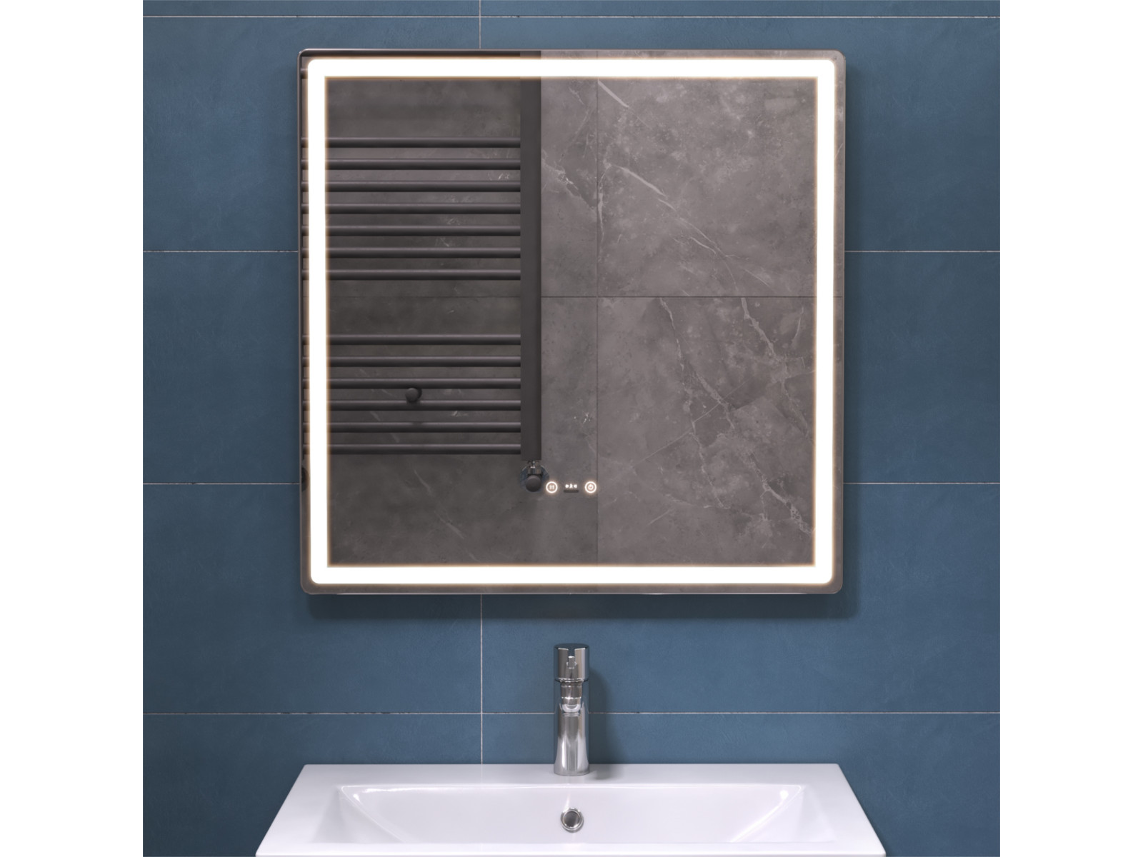 Подсветка фронтальная по периметру, с цветовой температурой 5000К – нейтральный белый, управление подсветкой сенсорное/датчик присутствия (1.5 м.)