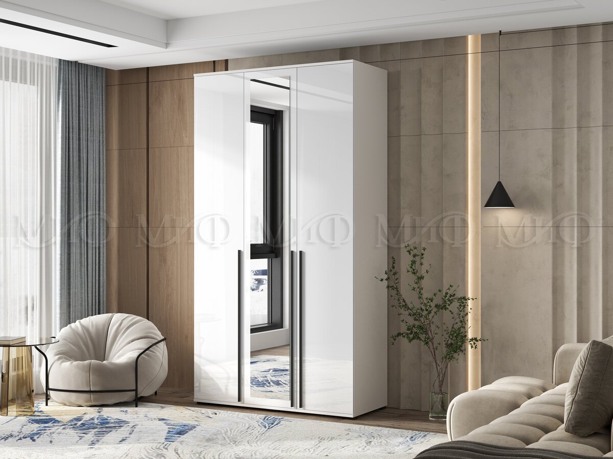 - Шкаф 3-х створчатый Норд 1200 с зеркалом белый глянец