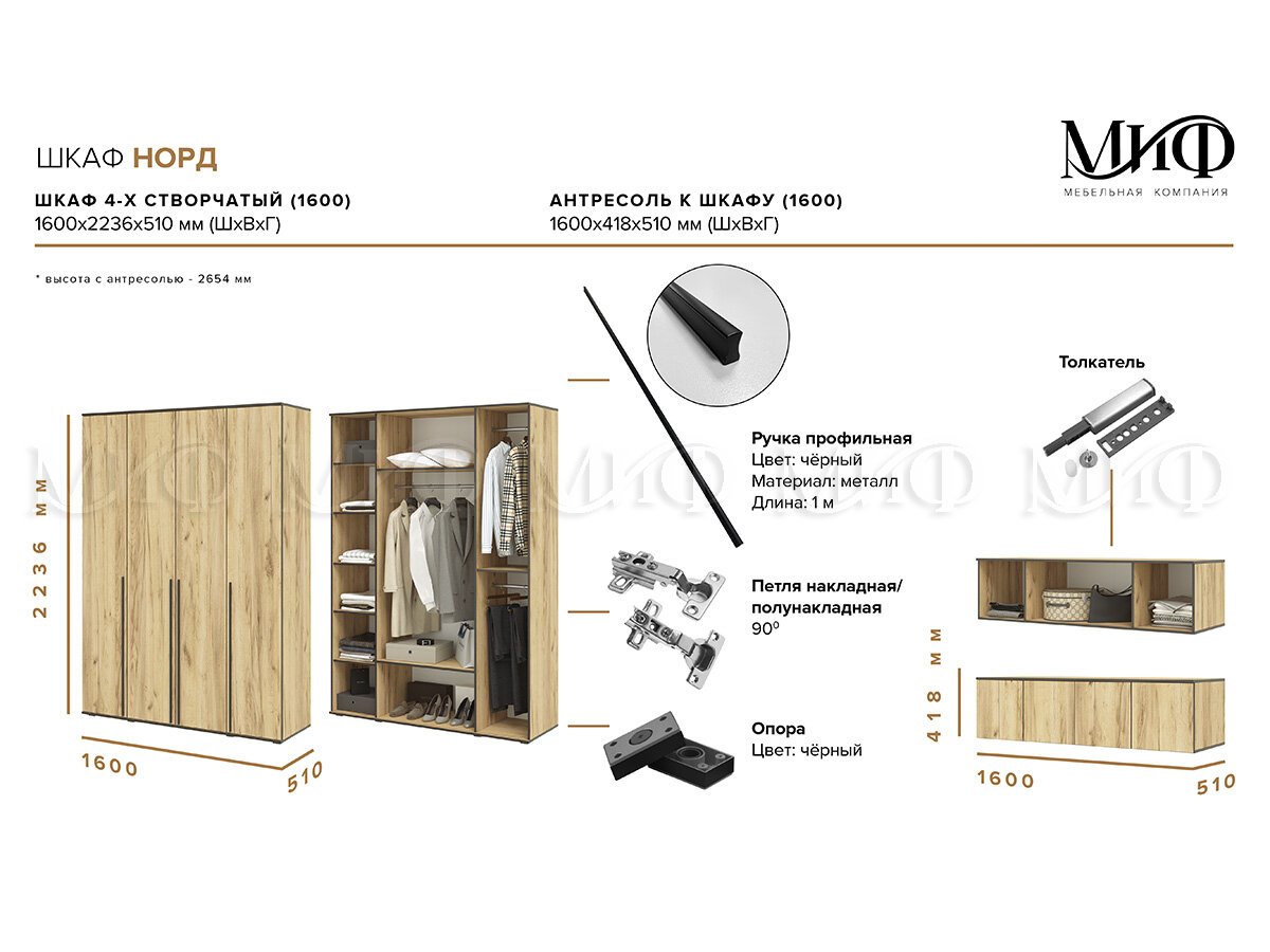 - Шкаф четырехстворчатый Норд 1600 белый глянец МГ