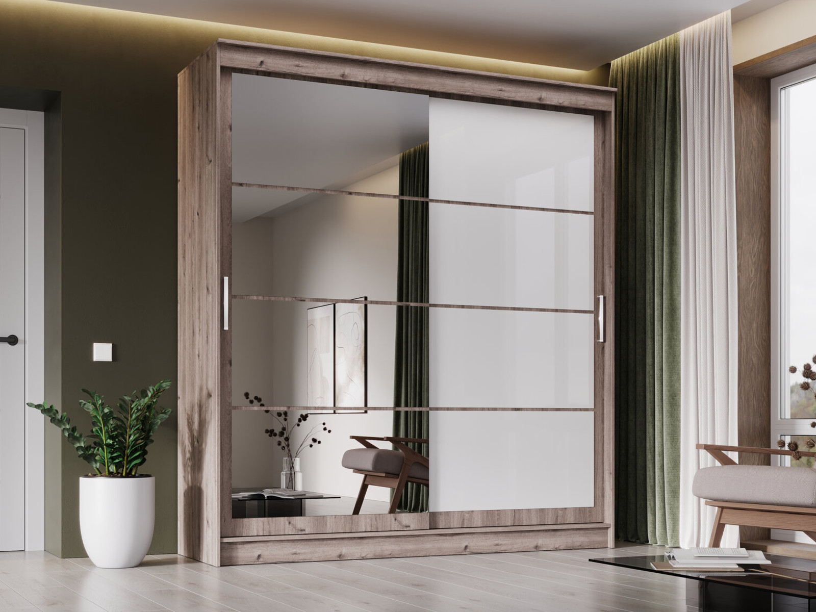 Шкаф-купе Гранд-1 2000 Дуб Горный-двери Зеркало-Лакобель белый