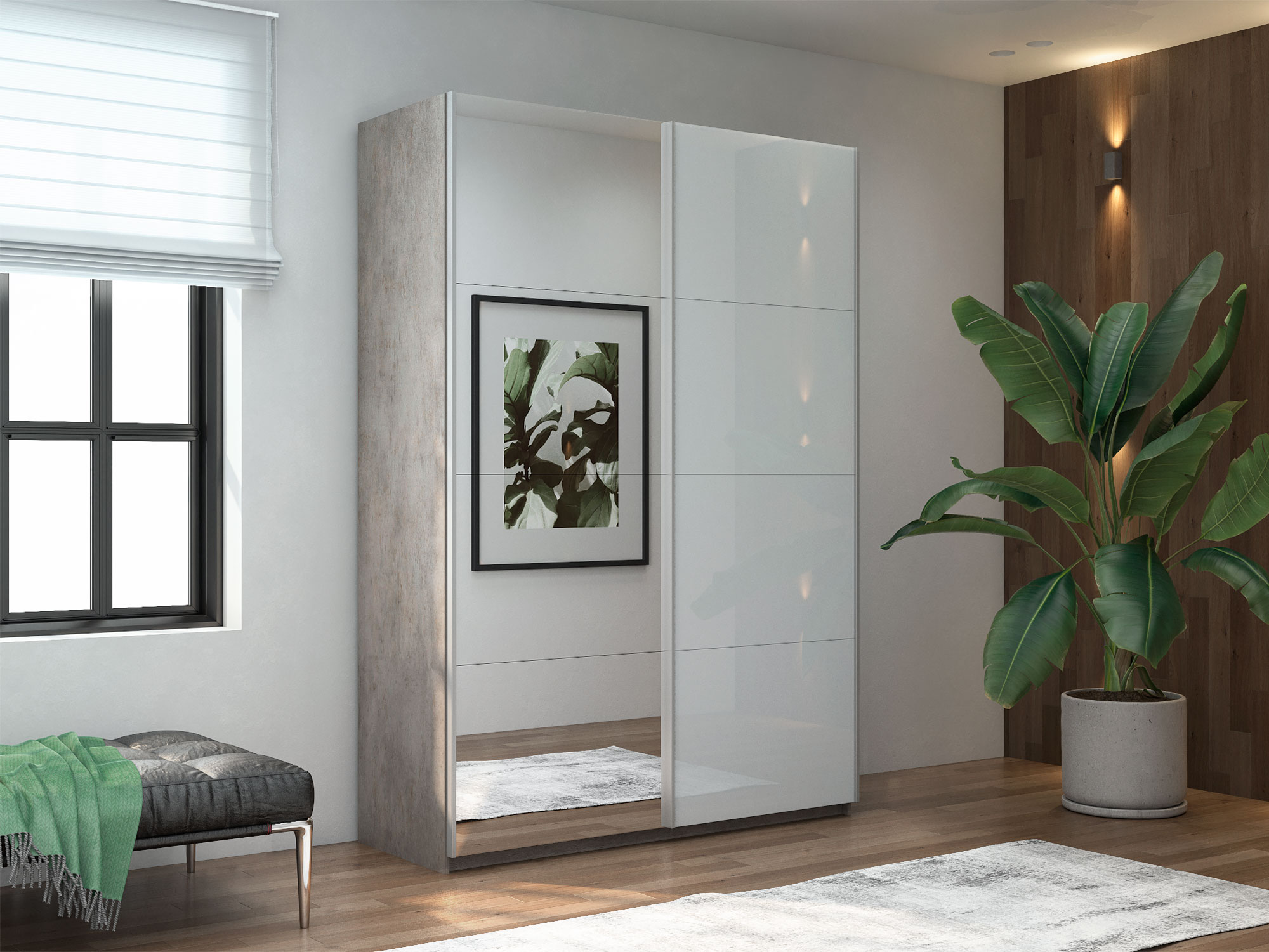 Шкаф-купе Прайм 2-х дверный 1400 Зеркало/Стекло Белое Бетон