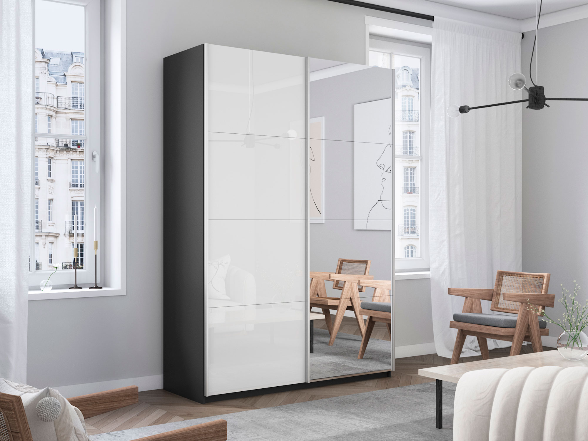 Шкаф-купе Прайм 2-х дверный 1400 Зеркало/Стекло Белое Серый Диамант