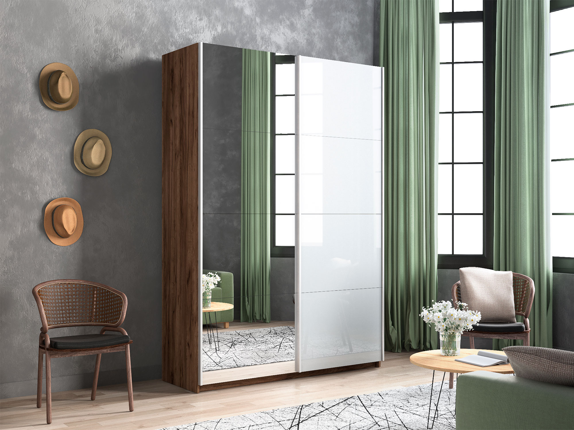 - Шкаф-купе Прайм 2-х дверный 1600 Зеркало/Стекло Белое Крафт табачный