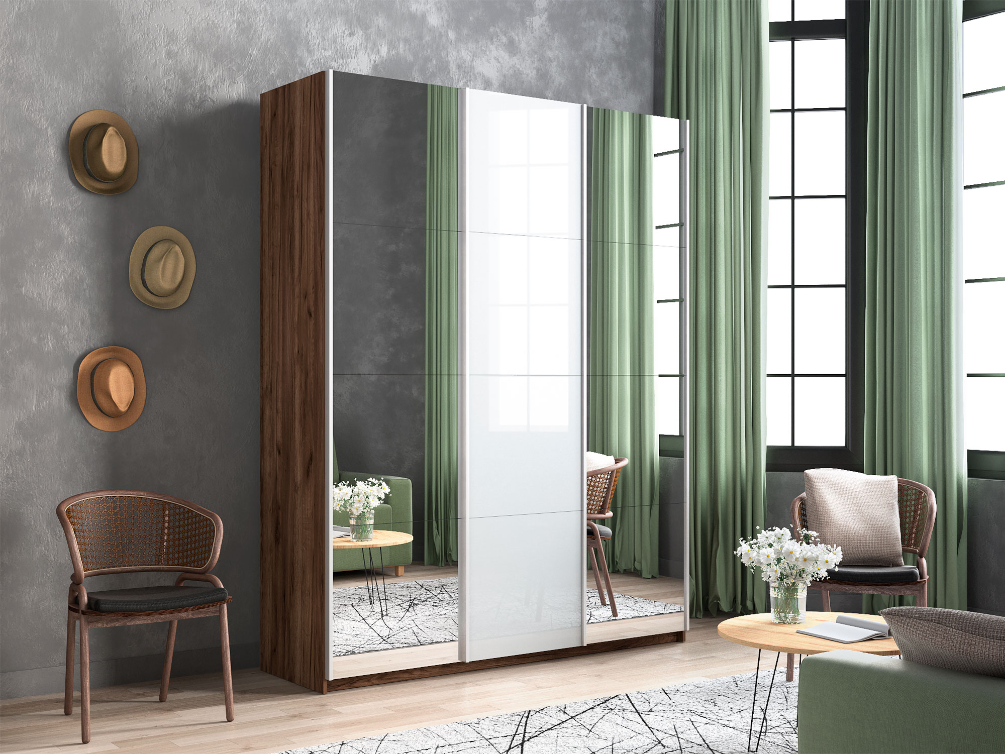 - Шкаф-купе Прайм 3-х дверный 1800 Зеркало/Стекло Белое/Зеркало Крафт табачный