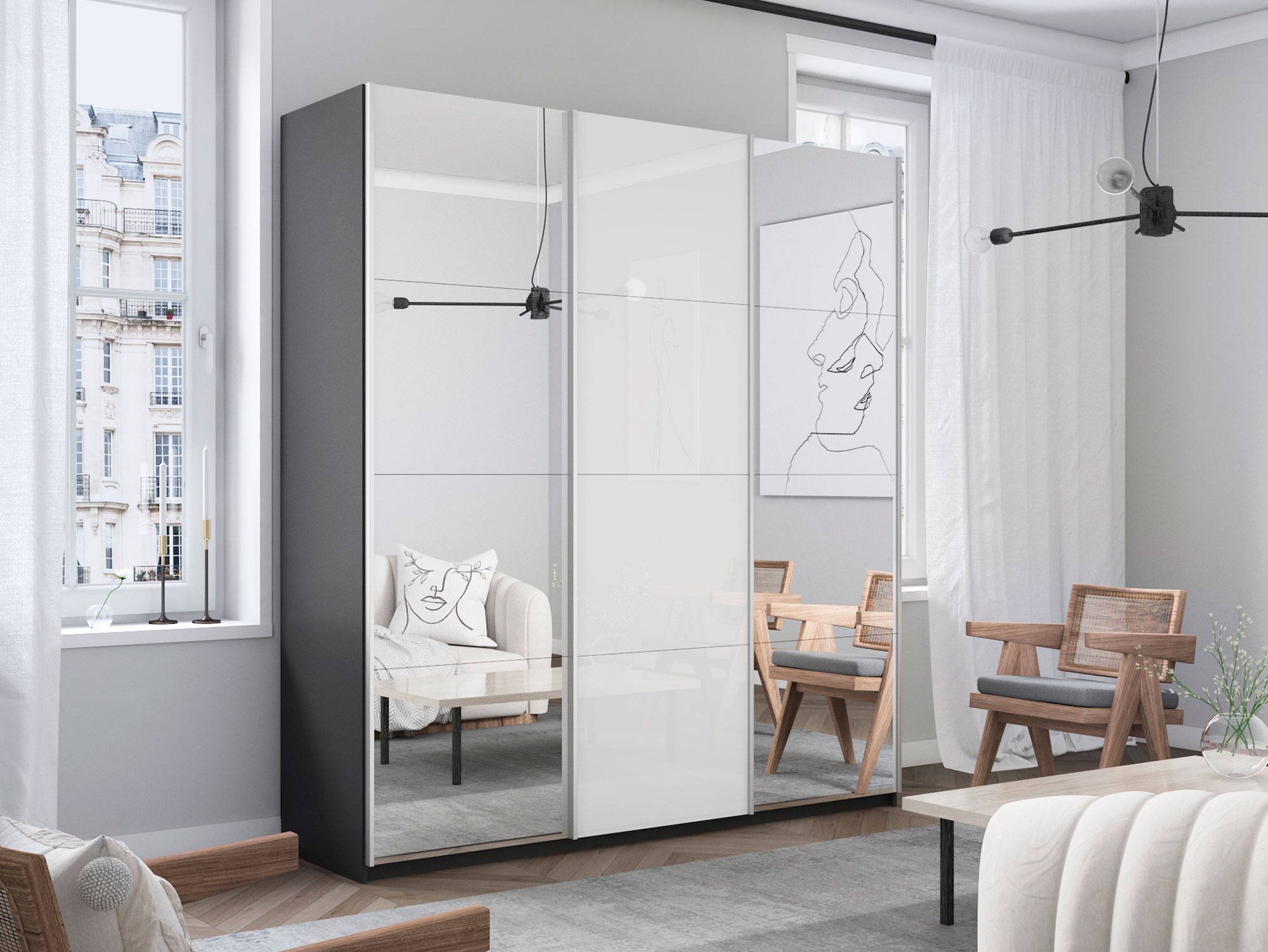 Шкаф-купе Прайм 3-х дверный 1800 Зеркало/Стекло Белое/Зеркало Серый Диамант