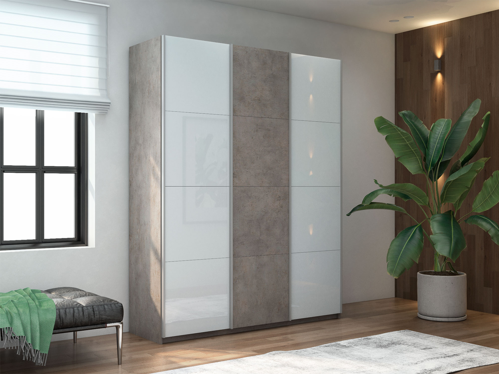 - Шкаф-купе Прайм 3-х дверный 2100 два Стекла Белые/ДСП Бетон