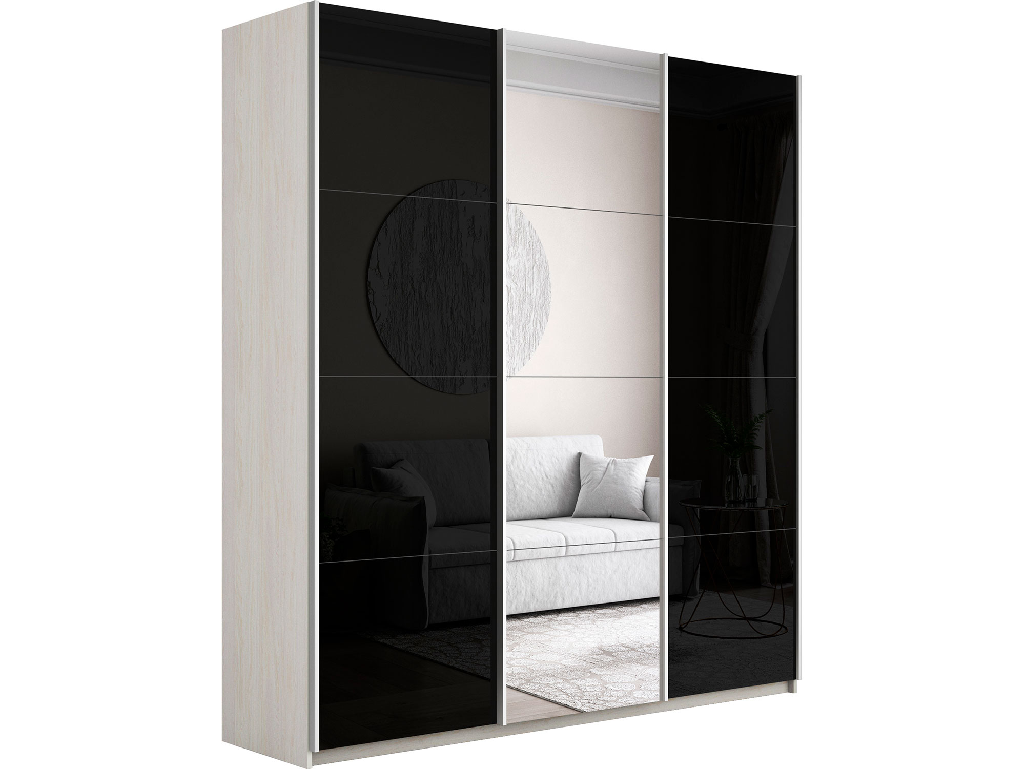 - Шкаф-купе Прайм 3-х дверный 2100 два Стекла Черные/Зеркало Ясень Анкор Светлый