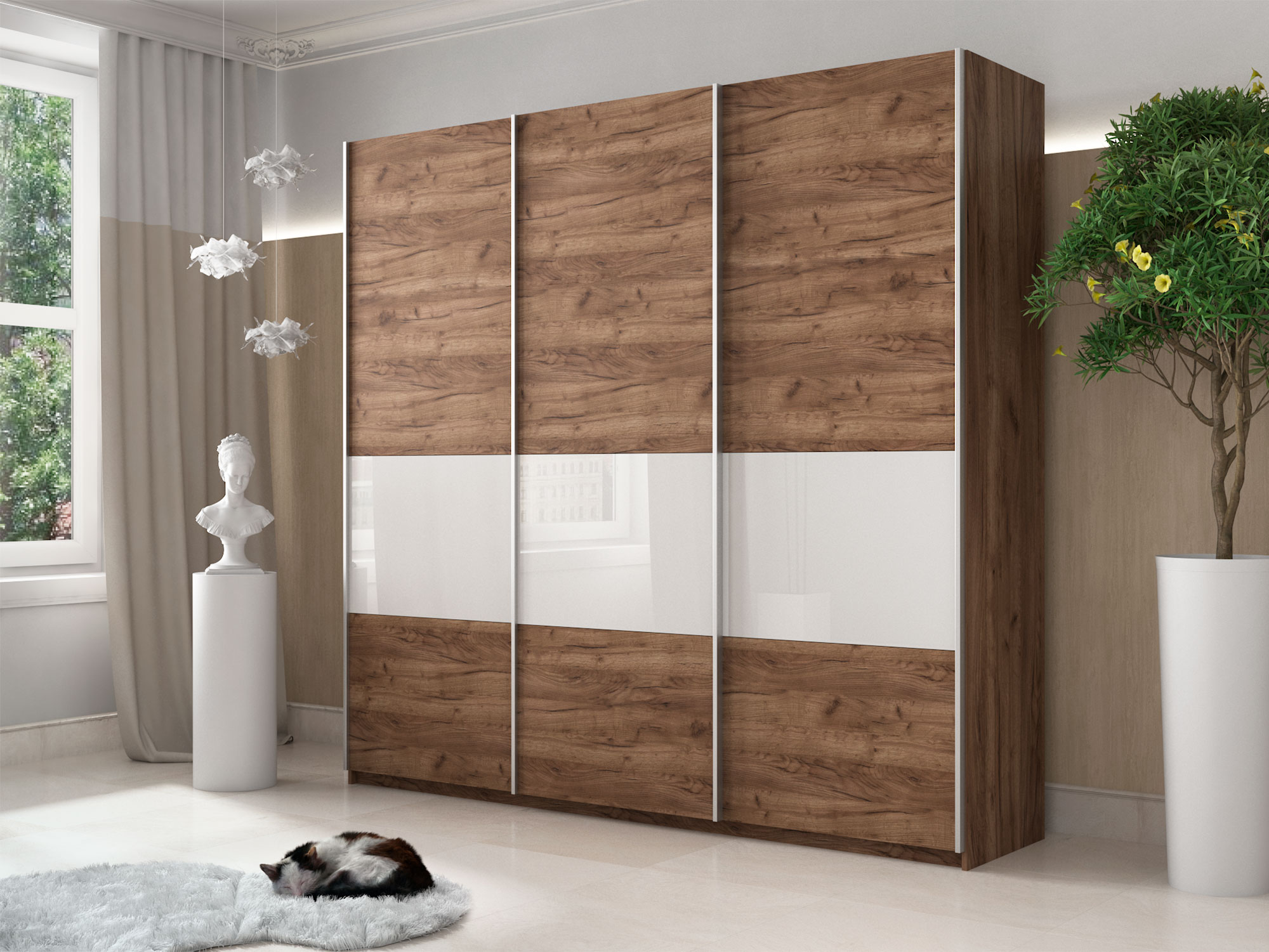 Шкаф-купе Прайм Широкий 3-х дверный ДСП/вставки Стекло Белое Крафт табачный