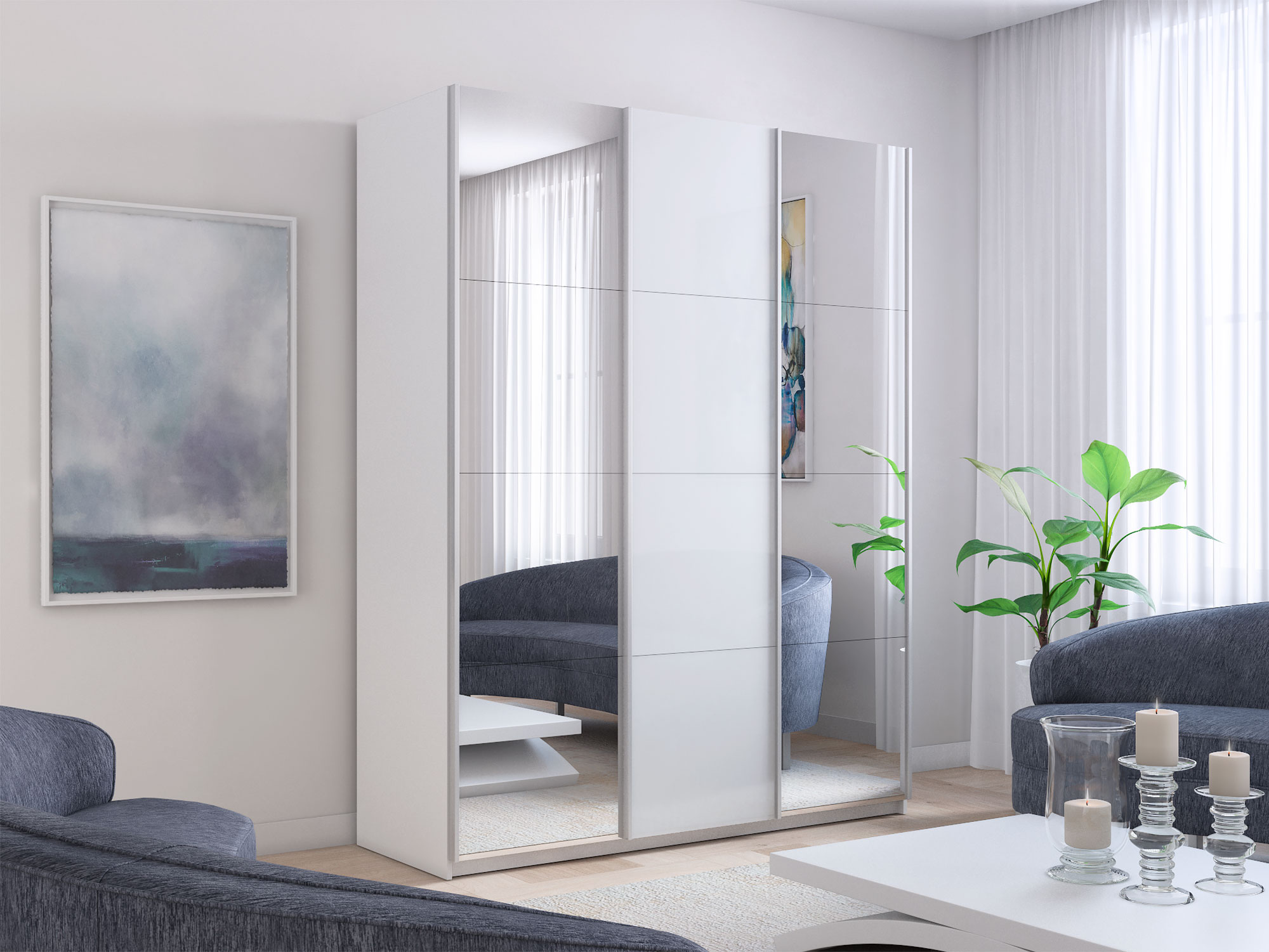 Шкаф-купе Прайм Широкий 3-х дверный два зеркала/стекло белое Белый Снег