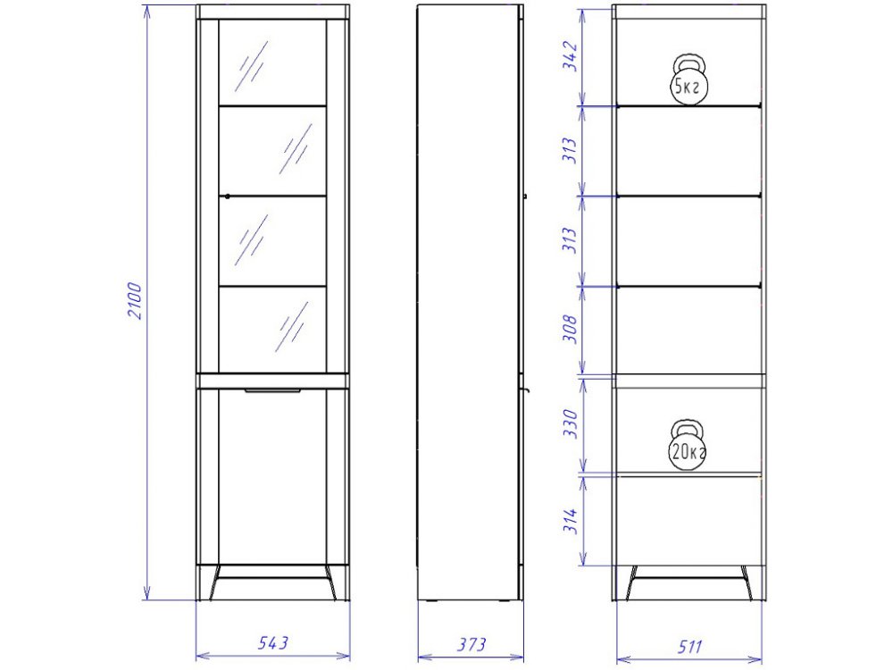 Пенал со стеклом Юта укомплектован полками по всей высоте: 3- стекло (максимальная нагрузка на полку стекло - 5кг), 1 - ЛДСП (максимальная нагрузка на полку - 15кг).